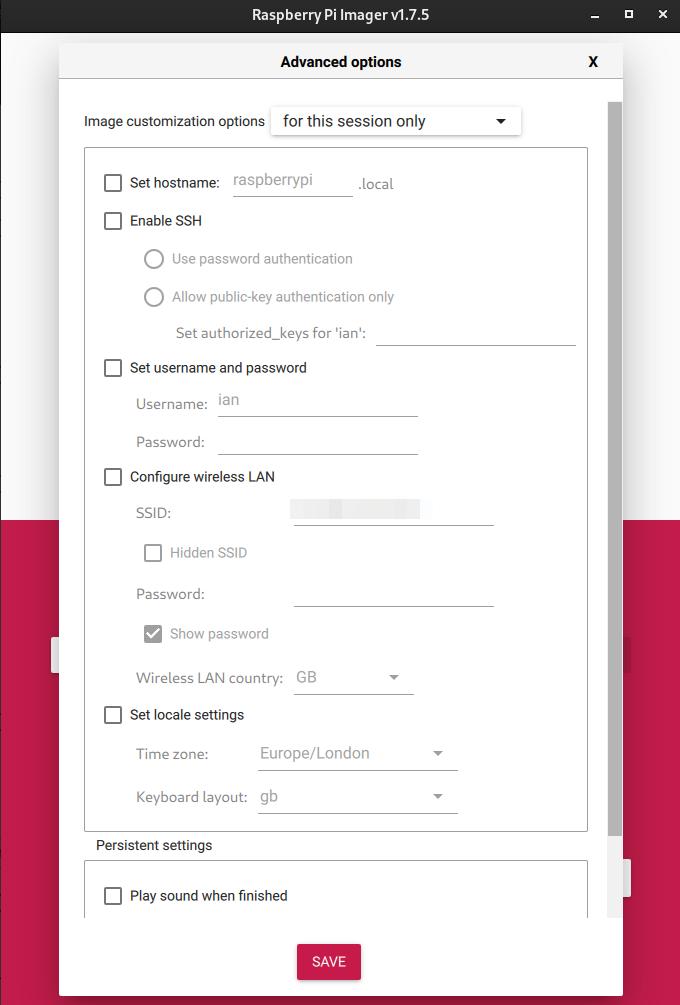 It’s now time to pre-configure your chosen image before writing it to SD card. To do this either click on the “gear” icon