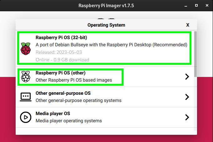 Otherwise you can select the second option “Raspberry Pi OS (Other)”. This will update the options to show a screen similar to the following: