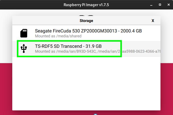 If you have multiple devices showing (as I do here), check the name and size of each device to help narrow it down to the correct one. In my case it is the “TS-RDF5 SD Transcend – 31.9 GB” option. I know this because “Transcend” is the manufacturer of the SD card reader that I plugged in to a USB socket, and the SD card in it is 32 GB in size. I definitely won’t want to select my 2 TB SSD by mistake 🙁
