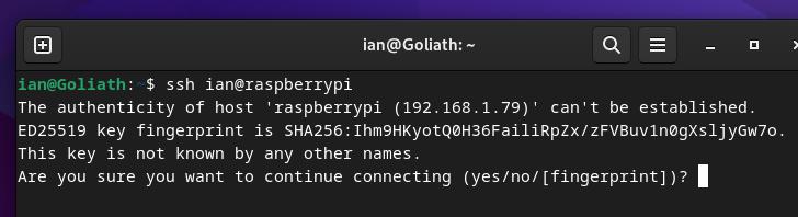 So for example I used a username of “ian” and left the hostname to default to “raspberrypi” so I would type the following in to my termal: