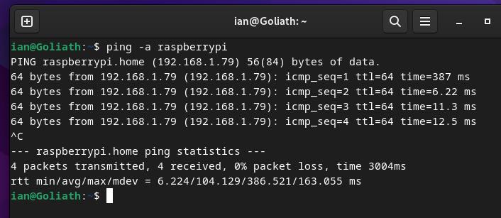 The result that you are seeking will be similar to below. Note that although we used the hostname to initiate the ping, if it is known it will tell you the actual IP address that the Raspberry Pi has been allocated.