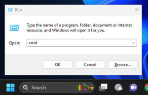 keys. Then in the dialog box that opens type in “cmd” and press the “Run” button: