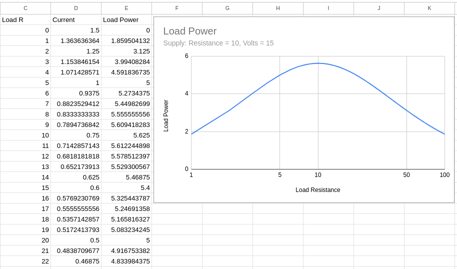 I have used a logarithmic scale for the ‘X’ axis as the power is related to the square of the current. Looking at the values for ‘I’ down column ‘D’ you can see that ‘I’ decreases steadily as ‘R’ decreases (in column ‘C’), but a strange thing happens to ‘P’ (in column ‘E’). At first it rises as ‘R’ rises up until ‘R’ reaches the source resistance value (10Ω in this case), when it starts to fall.