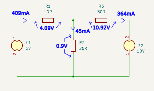 \(E_1 = 5V \\\) \(I_{E1} = 409mA \\\)\(I_{R1} = 409mA \) left to right