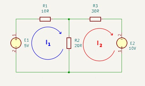 \(E_1 – I_1.R_1 – R_2.(I_1 – I_2) = 0 \\\) \(5 – 10.I_1 – 20.(I_1 – I_2) = 0 \\\) \(5 – 10.I_1 – 20.I_1 + 20.I_2 = 0 \\\) \(-30.I_1 + 20.I_2 = -5 \\\) \(30.I_1 – 20.I_2 = 5 \\\)KVL for I2