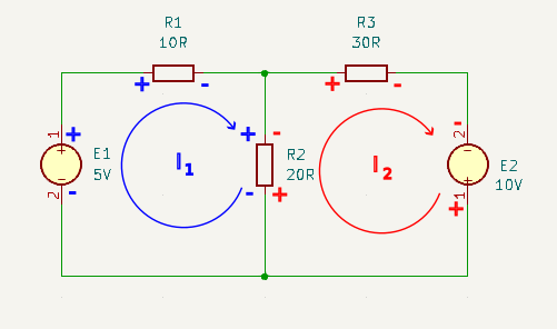 Note this means that components which are on the boundary between two loops may have two differing sets of polarities (one associated with each loop). This is fine as the current through that component is the sum of the currents contributed from each loop.